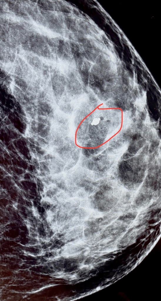 March 16 finally arrived, And Brian and I headed down to Mercy Breast Care, hoping to get some answers. Brian had to wait in the car because of the COVID-19 restrictions, and the especially considering the potential vulnerability of the patients that are seen in a breast radiology clinic. When I checked in with the receptionist, I asked the receptionist to verify which doctor I would be seeing…Because of my prior visit there I was hoping it would be Dr. Adnan Qalbani as he was such a comforting and compassionate provider during my past experience with the clinic. I was shocked when she said it would be neither Qalbani (Adnan’s mother is also a breast radiologist)…The senior Qalbani was not working in the clinic (especially since the pandemic began) and Adnan was out of town. She informed me I would be seeing Dr. Jill Veccio, his associate from Denver. So right off the bat, I was a little bit apprehensive with a new face in the mix, but those fears soon vanished as soon as I met her. First stop was the dressing room – to change into my “open in the front” hospital robe , and shortly after I changed, the tech came to get me for my ultrasound. As you can imagine I was nervously chatting with her and just kind of wondering what my reality was going to end up looking like… Of course every time she had measure some thing and click the mouse, I’d like “what was that”? …I remember seeing her put some numbers and measurements on the screen… And she left to get Dr.Jill….After what seemed like a really long time, They came into the room Dr.Jill instantly commented that she liked my cowboy boots…😂 she knew the way to this girl’s “good side”. She then explained that on my screening mammogram, they had seen a lot of calcifications and she was hoping to see that they laid out into a nice pattern instead of “random calcifications” here and there. She couldn’t seem to find any sort of pattern or uniformity in the layout of the calcifications despite having me change my position a few times. If there is a pattern or some sort of uniform appearance to the calcifications, they are more likely to be associated with a benign process (in other words not cancerous). Still, she did not raise the alarms yet…she told me that “sometimes gravity can help, so when we have you on the stereotactic table…” (which is basically what I would describe as a “dangling mammogram”) she continued “and once you’re in that position and sometimes those calcifications will fall into a pattern”. Dr. Jill went to consult with another patient…I went to the next waiting room 😂…The tech was a sweetheart (&also named Jill) & such a joy to visit with. They really know what they’re doing at that place and how to set the patient at ease that’s for sure… So I got up on the stereotactic table… It was quite high up and I love a challenge so I was like nope I got this and I crawled up there without batting an eye…It was basically like an unpadded massage table (very firm and not comfortable… I think I was dehydrated at the time I just couldn’t seem to get comfortable)but once we figured it out, she got my left boob adequately “dropped” through the hole ,got it all compressed & voila! the image of my left breast was up on the monitor. I do remember her looking for the right area and gasping “but you have so many!”…I believe I said “Whelp …I’m an all or nothing type of girl…anything I do , I go big or go home!” We both kind of laughed and Dr.Jill came back in, made sure everything was where it needed to be on the screen , Thshe said unfortunately those are not laying out like I hoped they would, so we’re going to have to proceed with the biopsy. She gave me a lidocaine shot to numb the biopsy area on my outer lower quadrant of my left breast. She was so comforting and did such a great job explaining every little movement she was making, as well as preparing me for what sounds I would be hearing (i.e,” now you’re going to hear a popping noise…like opening a bottle of champagne and that’s just a needle going in”and then she explained I was hearing the biopsy samples being vacuumed back up into the collection port, and then after the news collects three tissue samples, the machine washes out (also called lavage or irrigation) the inside of my breast where the needle was with normal saline…And then they placed a marker “so the surgeon could find it if I needed surgery” …that’s probably when I started to think…uhhhh this is probably not going to end the way that I hoped…I just felt like everything was gonna be fine and really be some diabetes related change that they were seeing in my breast or some other benign process. The tech applied pressure to the biopsy site incision for several minutes and then took a another mammogram image so we could see that the marker was in the right spot etc. I was able to sneak a picture -before I knew it wasn’t allowed…I just had my phone out because I was texting Brian that I was about done and quick snapped a picture of the screen. I still think it’s weird that you’re not allowed to take your own pictures like that but I guess I can see where sometimes information like that could be dangerous in the wrong hands. The tech gave me a little round ice pack to put inside of my bra and I was on my merry way! Now I just had to wait for the doctor to call me with my results in 3 to 4 daysI… was hoping that I would get the results by Friday as this was a Tuesday and I wouldn’t have to go all weekend waiting and wondering. Honestly, I was just ready to get my “good news” and move on. I think that was just me being in denial, because there were several intuitive moments and signs, in retrospect, an apparent attempt to prepare me for what was coming, but like they say, ignorance is bliss!